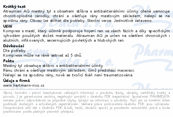 Atrauman AG mastný tyl s obsahem stříbra s antibakteriálními účinky cíleně usmrcuje choroboplodné zárodky, chrání a ošetřuje rány masťovým základem, nelepí se na spodinu rány. Obvaz lze stříhat dle potřeby. Sterilní verze. Jednotlivě zataveno.Použití