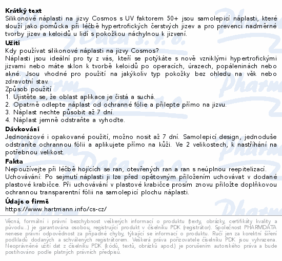 Silikonové náplasti na jizvy Cosmos s UV faktorem 50+ jsou samolepicí náplasti, které slouží jako pomůcka při léčbě hypertrofických čerstvých jizev a pro prevenci nadměrné tvorby jizev a keloidů u lidí s pokožkou náchylnou k jizvení.Použití