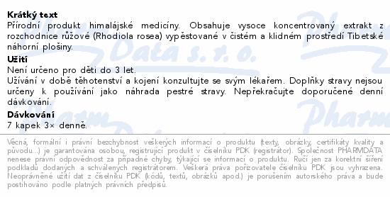 Přírodní produkt himalájské medicíny. Obsahuje vysoce koncentrovaný extrakt z rozchodnice růžové (Rhodiola rosea) vypěstované v čistém a klidném prostředí Tibetské náhorní plošiny.Použití