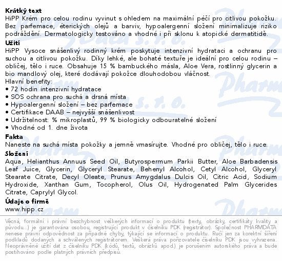 HiPP Krém pro celou rodinu vyvinut s ohledem na maximální péčí pro citlivou pokožku. Bez parfemace, éterických olejů a barviv, hypoalergenní složení minimalizuje riziko podráždění. Dermatologicky testováno a vhodné i při sklonu k atopické dermatitidě.Použití