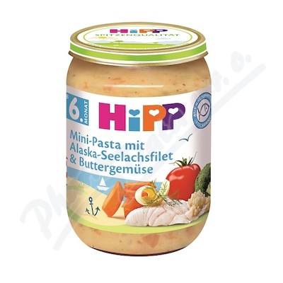 Masozeleninový příkrm HiPP Mini těstoviny s aljašskou treskou v máslové zelenině, pro děti od uk. 5. měsíce. Obsahuje omega-3 mastné kyseliny pro vývoj mozku a nervových buněk. Bez přídavku soli, obsahuje lepek.Použití