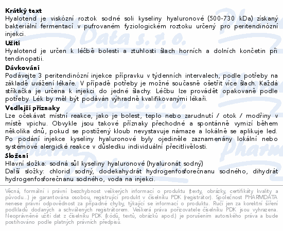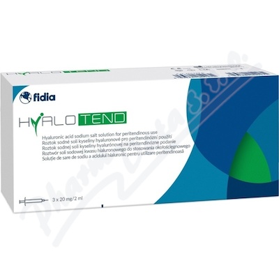 Hyalotend je viskózní roztok sodné soli kyseliny hyaluronové (500-730 kDa) získaný bakteriální fermentací v pufrovaném fyziologickém roztoku určený pro peritendinózní injekci.Použití
