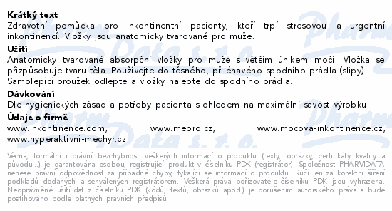 Zdravotní pomůcka pro inkontinentní pacienty, kteří trpí stresovou a urgentní inkontinencí. Vložky jsou anatomicky tvarované pro muže.Použití