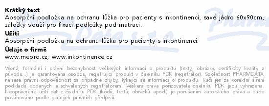 Absorpční podložka na ochranu lůžka pro pacienty s inkontinencí, savé jádro 60x90cm, záložky slouží pro fixaci podložky pod matraci.Použití