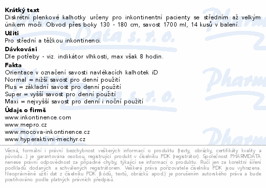 Diskrétní plenkové kalhotky určeny pro inkontinentní pacienty se středním až velkým únikem moči. Obvod přes boky 130 - 180 cm, savost 1700 ml, 14 kusů v balení.Použití