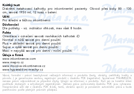 Diskrétní natahovací kalhotky pro inkontinentní pacienty. Obvod přes boky 80 - 130 cm, savost 1950 ml, 12 kusů v balení.Použití