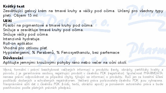 Zesvětlující gelový krém na tmavé kruhy a váčky pod očima. Určený pro všechny typy pleti. Objem 15 ml.Použití