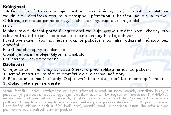 Zklidňující čistící balzám s tající texturou speciálně vyvinutý pro citlivou pleť se zarudnutím. Vícefázová textura s postupnou přeměnou z balzámu na olej a mléko. Odstraňuje make-up jemně bez zvýšeného tření, vyživuje a zklidňuje pleť.Použití