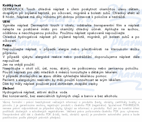DERMAPLICK Touch chladivá náplast s cílem poskytnot okamžitou úlevu dětem, dospělým při zvýšené teplotě, po očkovaní, migréně a bolesti zubů. Chladivý efekt až 8 hodin. Náplast má díky nízkému pH dobrou přilnavost k pokožce a nedráždí.Použití