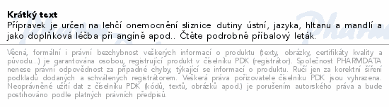 Přípravek je určen na lehčí onemocnění sliznice dutiny ústní, jazyka, hltanu a mandlí a jako doplňková léčba při angíně apod.. Čtěte pozorně příbalový leták.Použití