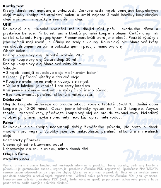 Krásný dárek pro nejrůznější příležitosti. Dárková sada nejoblíbenějších koupelových olejů značky Kneipp má atraktivní balení a uvnitř najdete 3 malé lahvičky koupelových olejů s přírodními výtažky a esenciálními oleji.Použití