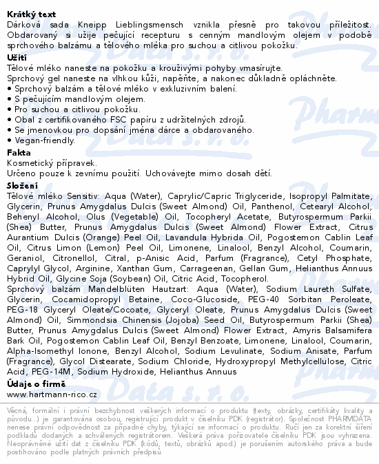 Dárková sada Kneipp Lieblingsmensch vznikla přesně pro takovou příležitost. Obdarovaný si užije pečující recepturu s cenným mandlovým olejem v podobě sprchového balzámu a tělového mléka pro suchou a citlivou pokožku.Použití