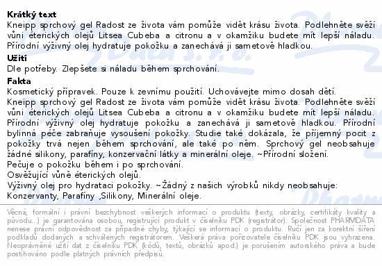 Kneipp sprchový gel Radost ze života vám pomůže vidět krásu života. Podlehněte svěží vůni éterických olejů Litsea Cubeba a citronu a v okamžiku budete mít lepší náladu. Přírodní výživný olej hydratuje pokožku a zanechává ji sametově hladkou.Použití