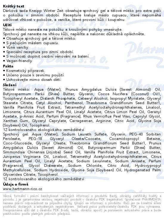 Dárková sada Kneipp Winter Zeit obsahuje sprchový gel a tělové mléko pro extra péči o pokožku v zimním období. Receptuře kraluje máslo cupuacu, které napomáhá udržovat vlhkost v pokožce, a vanilka, které provoní kůži i koupelnu.Použití