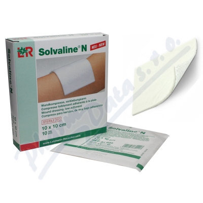Komprese SOLVALINE, speciální savá, oboustranně použitelná, 10x10 cm, REF 31835. Z vysoce savé bavlněné vaty, která je na obou stranách pokryta jemně perforovanou polyesterovou fólií.Použití