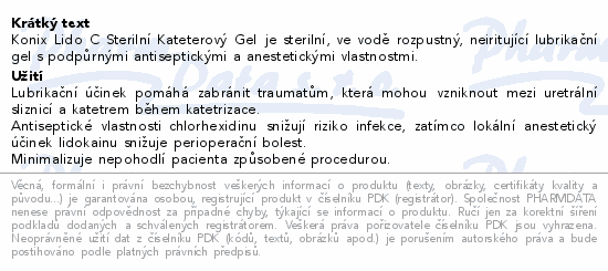 Konix Lido C Sterilní Kateterový Gel je sterilní, ve vodě rozpustný, neiritující lubrikační gel s podpůrnými antiseptickými a anestetickými vlastnostmi.Použití