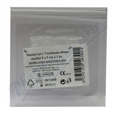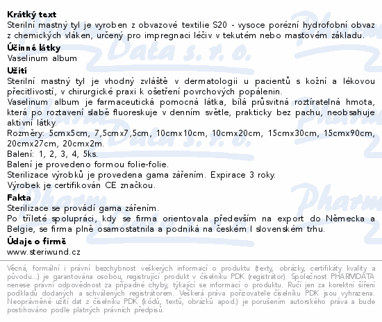 Sterilní mastný tyl je vyroben z obvazové textilie S20 - vysoce porézní hydrofobní obvaz z chemických vláken, určený pro impregnaci léčiv v tekutém nebo masťovém základu.Použití