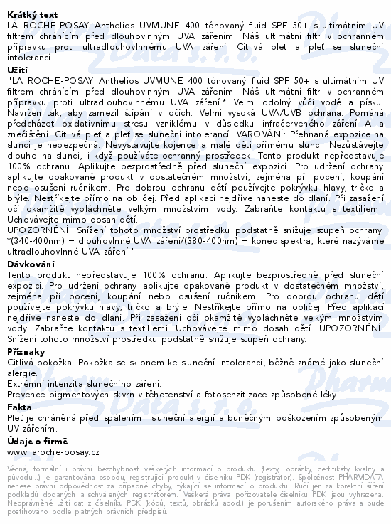 LA ROCHE-POSAY Anthelios UVMUNE 400 tónovaný fluid SPF 50+ s ultimátním UV filtrem chránícím před dlouhovlnným UVA zářením. Náš ultimátní filtr v ochranném přípravku proti ultradlouhovlnnému UVA záření. Citlivá pleť a pleť se sluneční intolerancí.Použití