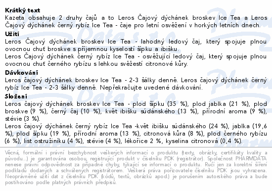 Kazeta obsahuje 2 druhy čajů a to Leros Čajový dýchánek broskev Ice Tea a Leros Čajový dýchánek černý rybíz Ice Tea - čaje pro letní osvěžení v horkých letních dnech.Použití
