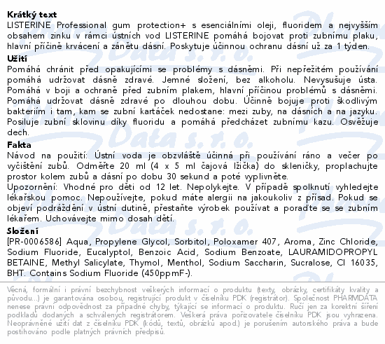 LISTERINE Professional gum protection+ s esenciálními oleji, fluoridem a nejvyšším obsahem zinku v rámci ústních vod LISTERINE pomáhá bojovat proti zubnímu plaku, hlavní příčině krvácení a zánětu dásní. Poskytuje účinnou ochranu dásní už za 1 týden.Použití