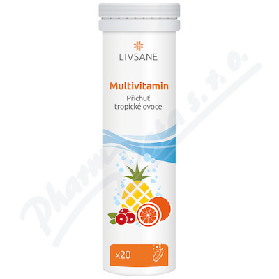 LIVSANE šumivý multivitamín s příchutí tropického ovoce, balení 20 šumivých tablet. Navrženo, aby dodal všechny potřebné vitamíny pro zdravý životní styl. Přispívá k odstranění únavy, podporuje metabolismus a nervový systém.Použití