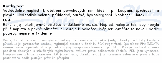 Voděodolné náplasti k ošetření povrchových ran. Ideální při koupání, sprchování a plavání. Jednotlivě balené, průhledné, pružné, hypoalergenní. Neobsahují latex.Použití