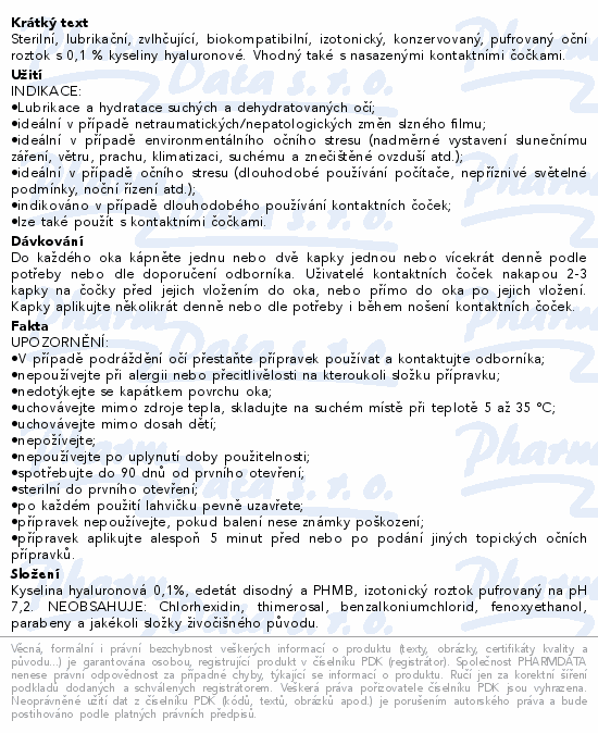 Sterilní, lubrikační, zvlhčující, biokompatibilní, izotonický, konzervovaný, pufrovaný oční roztok s 0, 1 % kyseliny hyaluronové. Vhodný také s nasazenými kontaktními čočkami.Použití