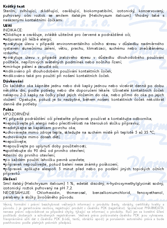 Sterilní, zvlhčující, zklidňující, osvěžující, biokompatibilní, izotonický, konzervovaný, pufrovaný oční roztok se smilem italským (Helichrysum italicum). Vhodný také s nasazenými kontaktními čočkami.Použití
