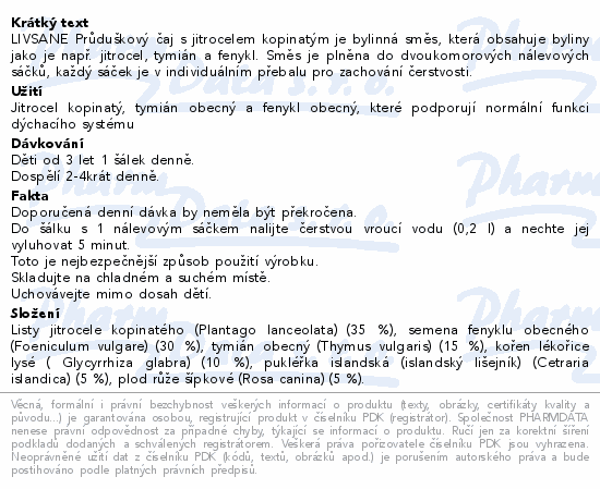 LIVSANE Průduškový čaj s jitrocelem kopinatým je bylinná směs, která obsahuje byliny jako je např. jitrocel, tymián a fenykl. Směs je plněna do dvoukomorových nálevových sáčků, každý sáček je v individuálním přebalu pro zachování čerstvosti.Použití