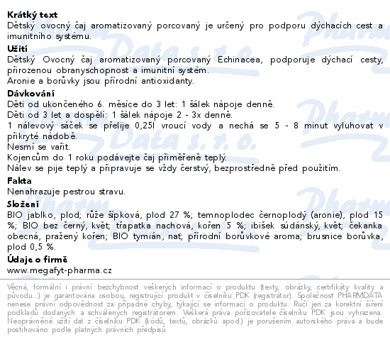 Dětský ovocný čaj aromatizovaný porcovaný je určený pro podporu dýchacích cest a imunitního systému.Použití