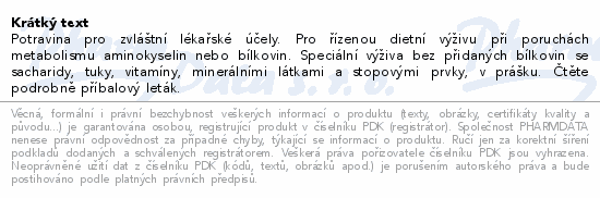 Potravina pro zvláštní lékařské účely. Pro řízenou dietní výživu při poruchách metabolismu aminokyselin nebo bílkovin. Speciální výživa bez přidaných bílkovin se sacharidy, tuky, vitamíny, minerálními látkami a stopovými prvky, v prášku. Čtěte pozorně příbalový leták.Použití