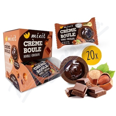 Créme boule - Double chocolate - Datlový koláček s kakaem plněný lískooříškovým krémem s fondánem - harmonie datlí a kvalitního kakaa bez palmového oleje a bez zbytečných umělých přísad a chemie.Použití