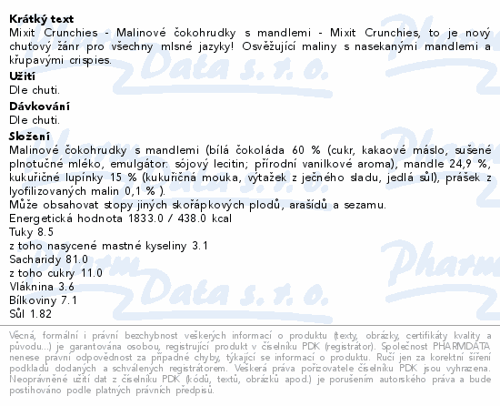 Mixit Crunchies - Malinové čokohrudky s mandlemi - Mixit Crunchies, to je nový chuťový žánr pro všechny mlsné jazyky! Osvěžující maliny s nasekanými mandlemi a křupavými crispies.Použití