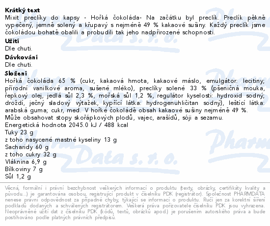 Mixit preclíky do kapsy - Hořká čokoláda- Na začátku byl preclík. Preclík pěkně vypečený, jemně solený a křupavý s nejméně 49 % kakaové sušiny. Každý preclík jsme čokoládou bohatě obalili a probudili tak jeho nadpřirozené schopnosti.Použití