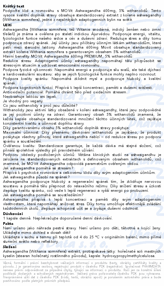 Podpořte klid a rovnováhu s MOVit Ashwagandha 600mg, 5% withanolidů. Tento vysoce kvalitní doplněk stravy obsahuje standardizovaný extrakt z kořene ashwagandhy (Withania somnifera), jedné z nejsilnějších adaptogenních bylin na světě.Použití