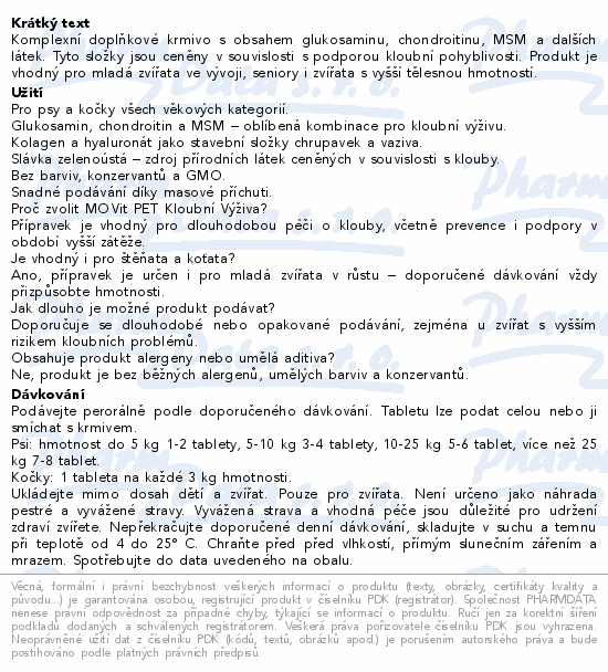 Komplexní doplňkové krmivo s obsahem glukosaminu, chondroitinu, MSM a dalších látek. Tyto složky jsou ceněny v souvislosti s podporou kloubní pohyblivosti. Produkt je vhodný pro mladá zvířata ve vývoji, seniory i zvířata s vyšší tělesnou hmotností.Použití