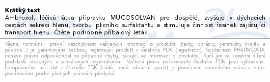 Ambroxol, léčivá látka přípravku MUCOSOLVAN pro dospělé, zvyšuje v dýchacích cestách sekreci hlenu, tvorbu plicního surfaktantu a stimuluje činnost řasinek zajišťující transport hlenu. Čtěte pozorně příbalový leták.Použití