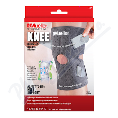 Produktová řada Mueller Adjust-To-Fit® pomáhá zabránit dalšímu zranění tím, že omezuje rozsah pohybu a urychluje tak zotavení. Patentované, nastavitelné vnitřní popruhy poskytují komfortní zpevnění kolenní oblasti a snadno se uchycují.Použití