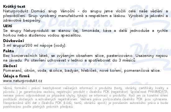 Naturprodukt Domácí sirup Vánoční - do sirupu jsme vložili celé naše vědění a přesvědčení. Sirup vyrobený manufakturně s respektem a láskou. Výrobek je jakostní a zdravotně bezpečný.Použití