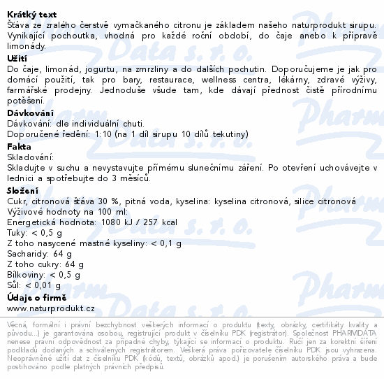 Šťáva ze zralého čerstvě vymačkaného citronu je základem našeho naturprodukt sirupu. Vynikající pochoutka, vhodná pro každé roční období, do čaje anebo k přípravě limonády.Použití