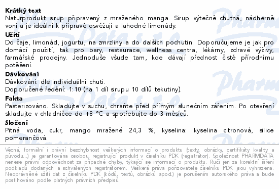 Naturprodukt sirup připravený z mraženého manga. Sirup výtečně chutná, nádherně voní a je ideální k přípravě osvěžují a lahodné limonády.Použití