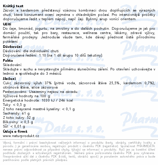 Naturprodukt sirup Zázvorový s kardamonem 250ml