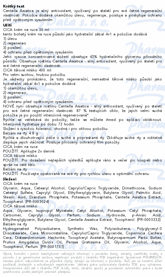 Centella Asiatica je silný antioxidant, využívaný po staletí pro své četné regenerační vlastnosti. Pokožce dodává okamžitou úlevu, regeneruje, posiluje a poskytuje ochranu před opětovným vysušením.Použití