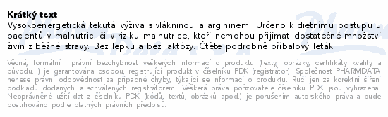 Vysokoenergetická tekutá výživa s vlákninou a argininem. Určeno k dietnímu postupu u pacientů v malnutrici či v riziku malnutrice, kteří nemohou přijímat dostatečné množství živin z běžné stravy. Bez lepku a bez laktózy. Čtěte pozorně příbalový leták.Použití
