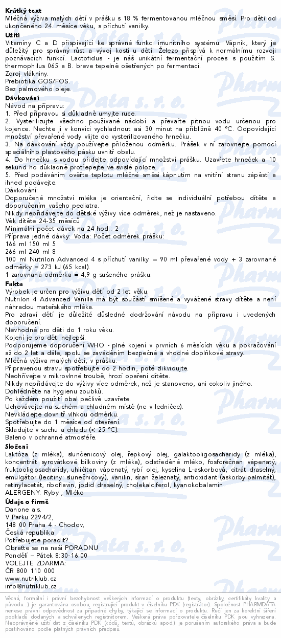 Mléčná výživa malých dětí v prášku s 18 % fermentovanou mléčnou směsí. Pro děti od ukončeného 24. měsíce věku, s příchutí vanilky.Použití