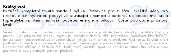 Nutričně kompletní tekutá sondová výživa. Potravina pro zvláštní lékařské účely pro řízenou dietní výživu při podvýživě související s nemocí u pacientů s diabetes mellitus a hyperglykémií, kteří mají vyšší potřebu energie a bílkovin. Čtěte pozorně příbalový leták.Použití