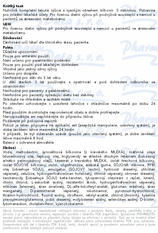 Nutričně kompletní tekutá výživa s vysokým obsahem bílkovin. S vlákninou. Potravina pro zvláštní lékařské účely. Pro řízenou dietní výživu při podvýživě související s nemocí u pacientů ve stresovém metabolismu.Použití