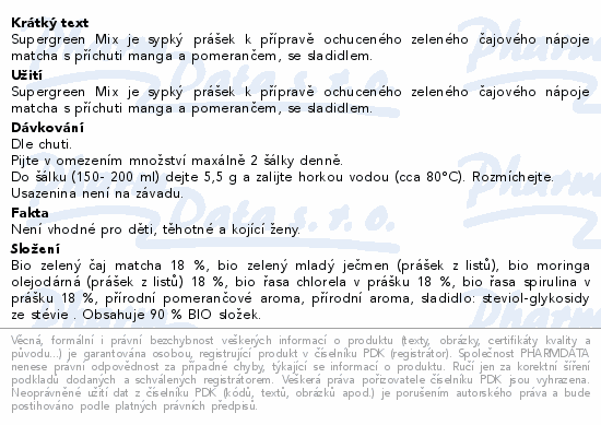 Supergreen Mix je sypký prášek k přípravě ochuceného zeleného čajového nápoje matcha s příchuti manga a pomerančem, se sladidlem.Použití