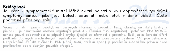 Je určen k symptomatické místní léčbě akutní bolesti v krku doprovázené typickými symptomy zánětu, jako jsou bolest, zarudnutí nebo otok v dané oblasti. Čtěte pozorně příbalový leták.Použití