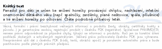 Panadol pro děti je určen ke snížení horečky provázející chřipku, nachlazení, infekční onemocnění dětského věku (např. spalničky, zarděnky, plané neštovice, spála, příušnice) a ke snížení horečky po očkování. Čtěte pozorně příbalový leták.Použití